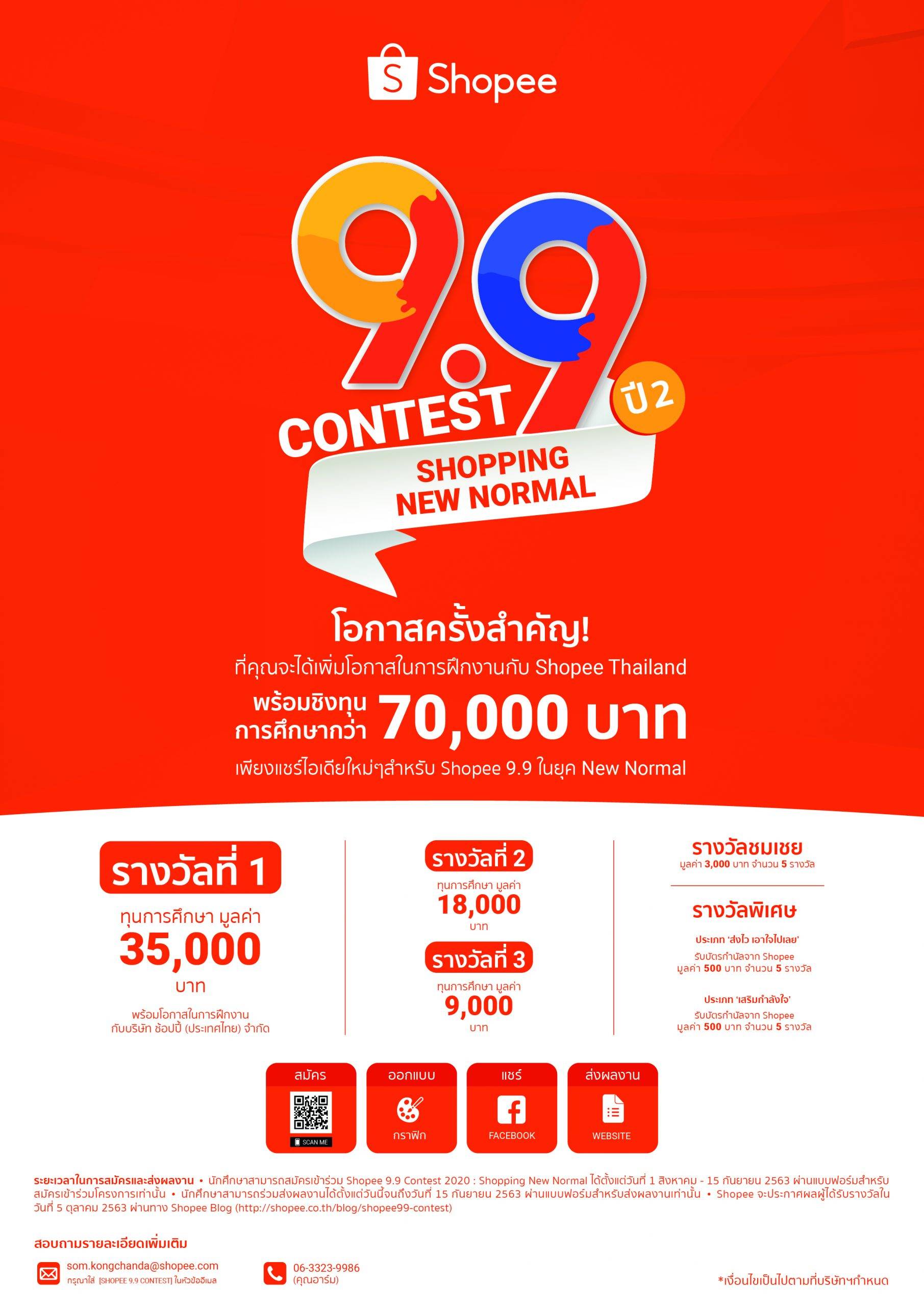 ⭐️ Shopee 9.9 Contest กลับมาท้านักศึกษาทั่วประเทศอีกครั้ง! กับโจทย์ Shopping New Normal ชิงรางวัลรวมกว่า 70,000 บาท พร้อมโอกาสในการฝึกงานกับ Shopee Thailand! เพียงนำเสนอไอเดียกระตุ้นการช้อปปิ้งในยุค New Normal ให้ตอบโจทย์ของ Shopee ไอเดียไหนปังที่สุดรับรางวัลไปเลย! สมัครได้ตั้งแต่วันนี้ – 15 กันยายนนี้เท่านั้น!